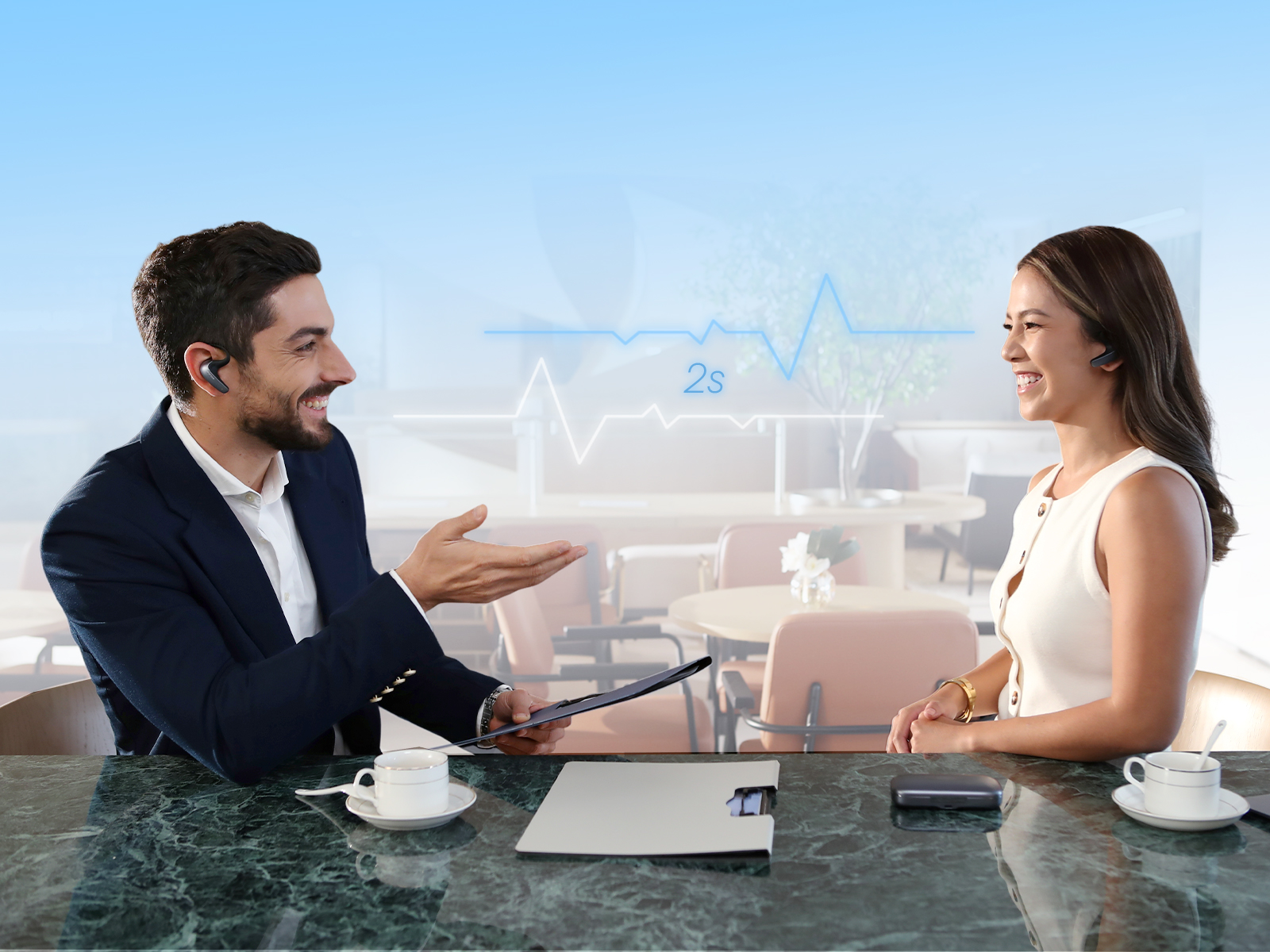 For sound pickup, it integrates a bone conduction microphone + a linear array of dual air conduction microphones, and is equipped with a bone conduction voiceprint tracking noise reduction algorithm to accurately eliminate background interference; For broadcast, the speaker is aligned with the ear canal, with directional sound transmission + ANC noise reduction added to suppress sound leakage, ensuring ultra clear hearing for both parties.