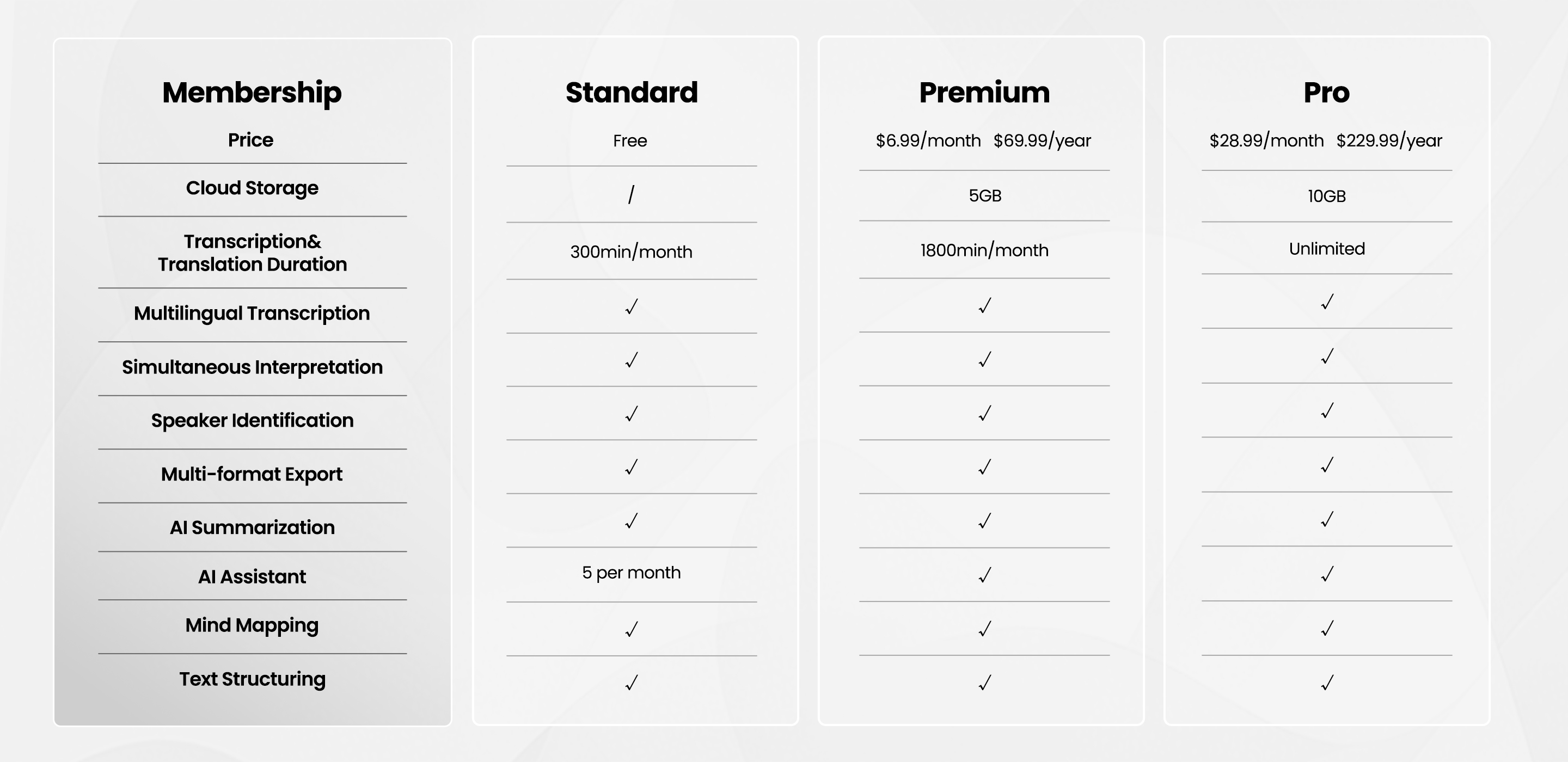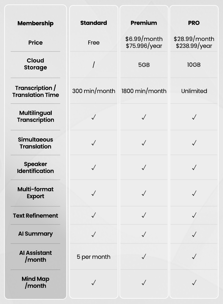 AI Meeting Assistant: Supports generating meeting summaries, keywords, speaker highlights, to-do lists, discourse coherence, filler cleaning, Q&A, and mind mapping.