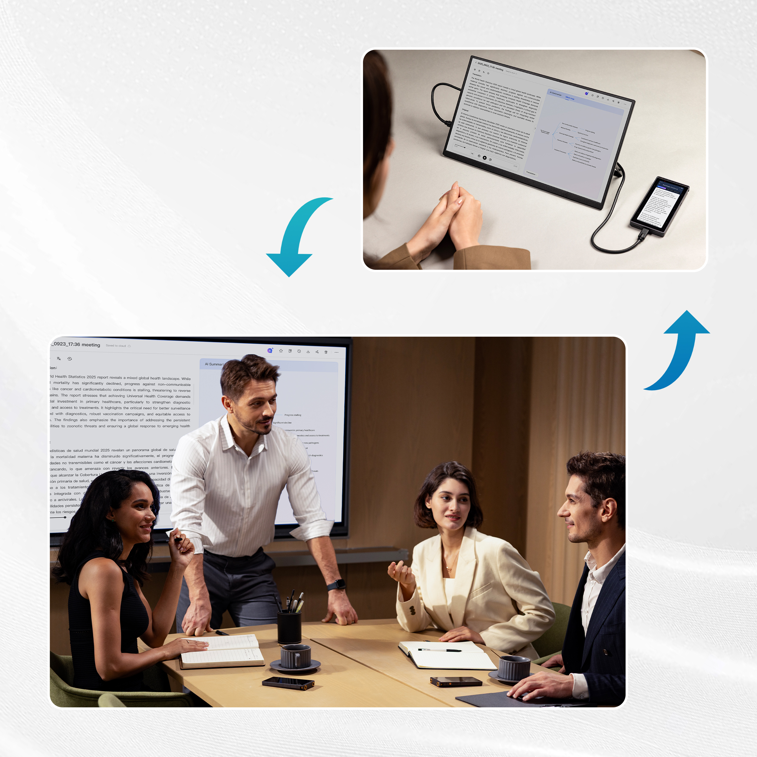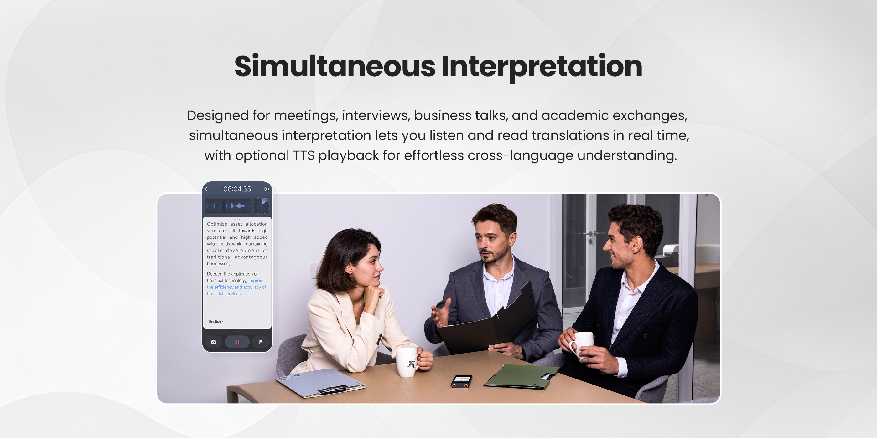 Wireless/wired Casting: Supports wired screen casting with an auto-adaptive interface during transcription and simultaneous interpretation.