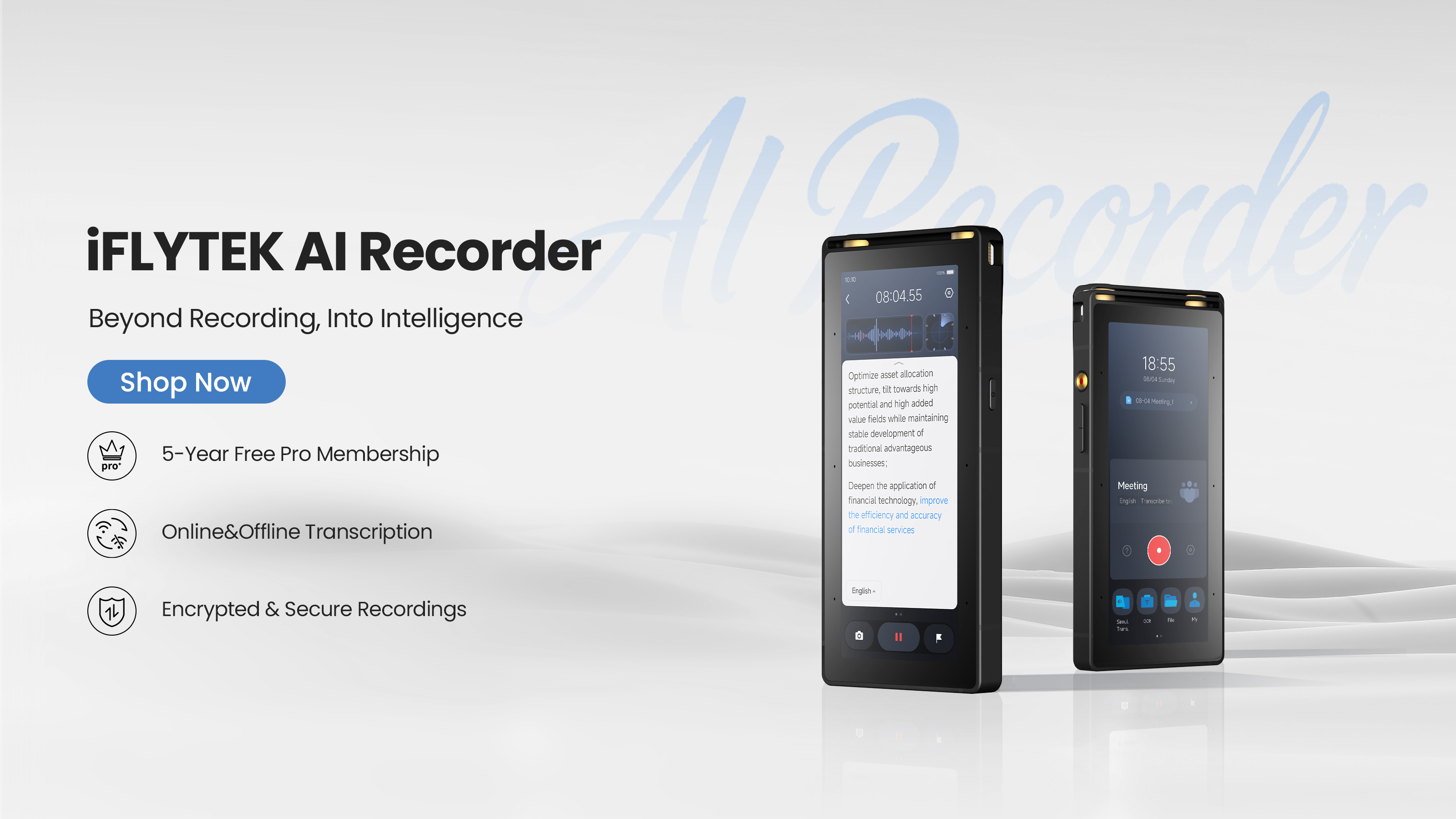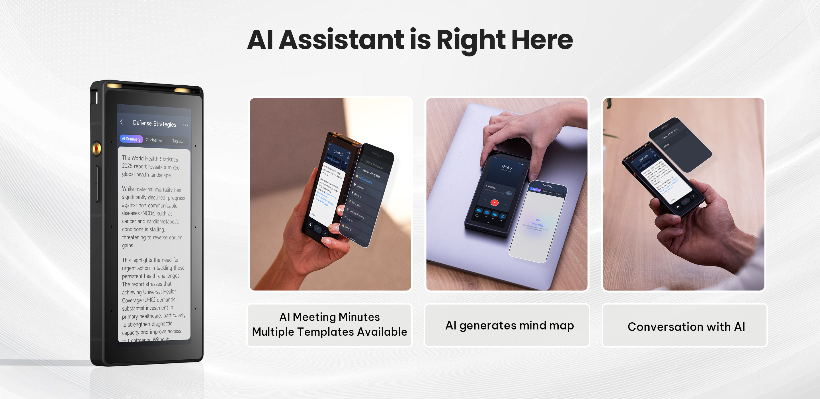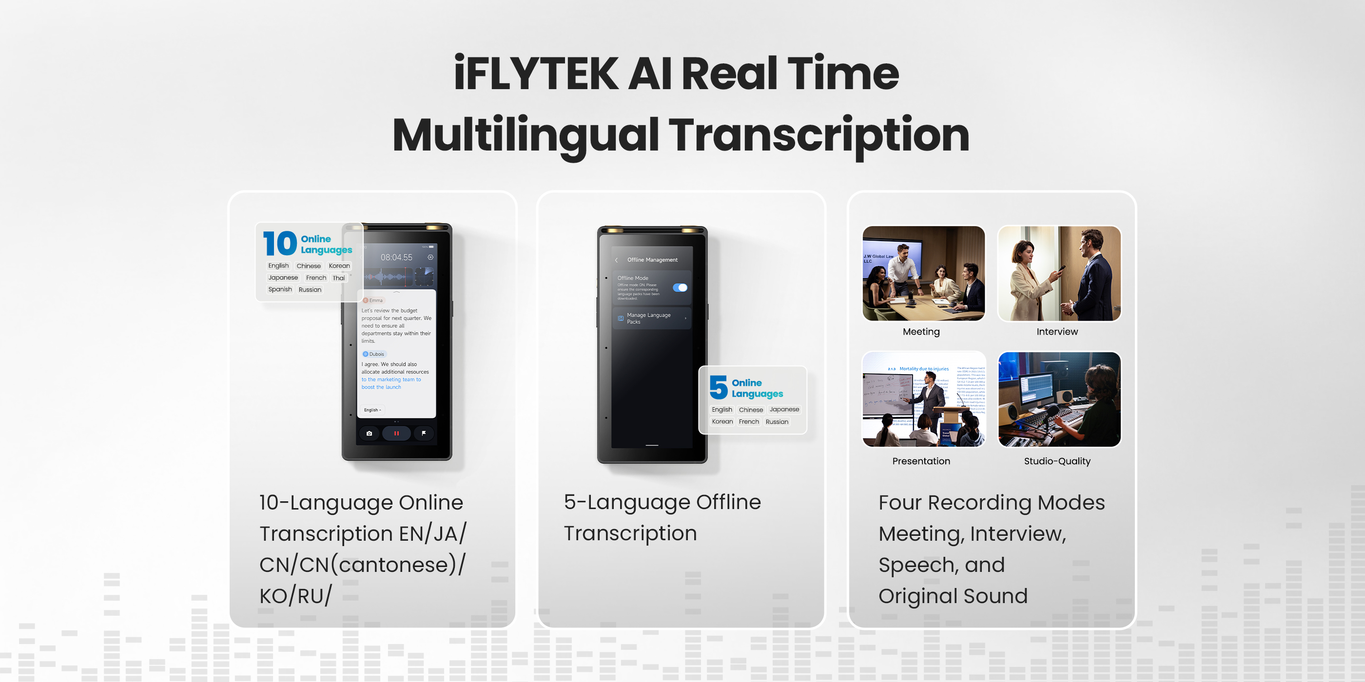 Four Recording Modes: Meeting, Interview, Speech, and Original Sound, with speaker differentiation and source localization.