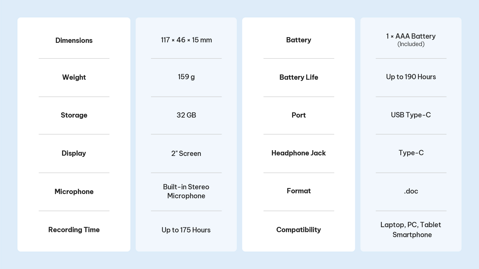 Large-capacity storage: The AI voice recorder is equipped with 32GB storage space, easily storing a large number of recordings and transcription content, reducing the hassle of frequent cleanup.