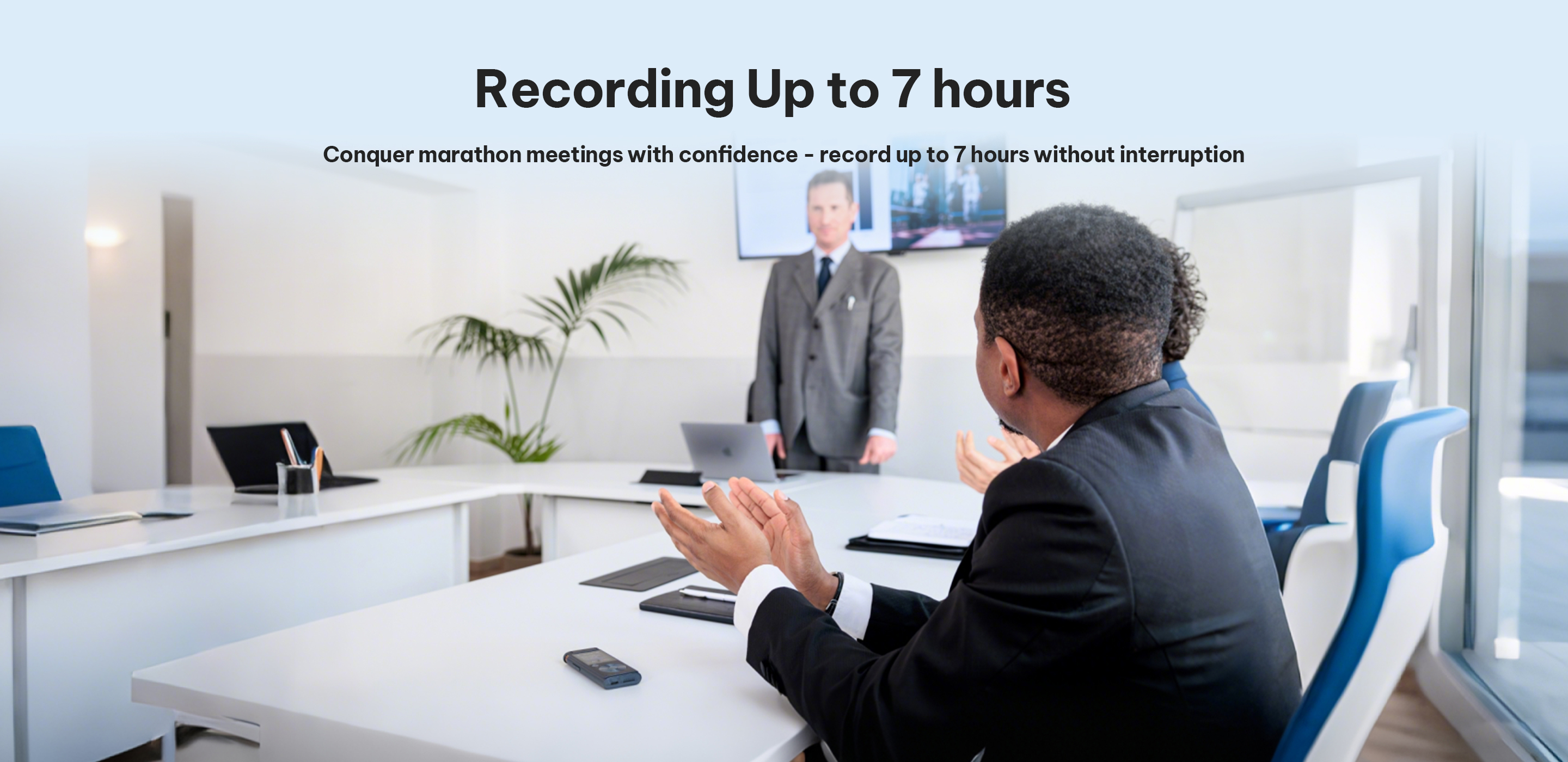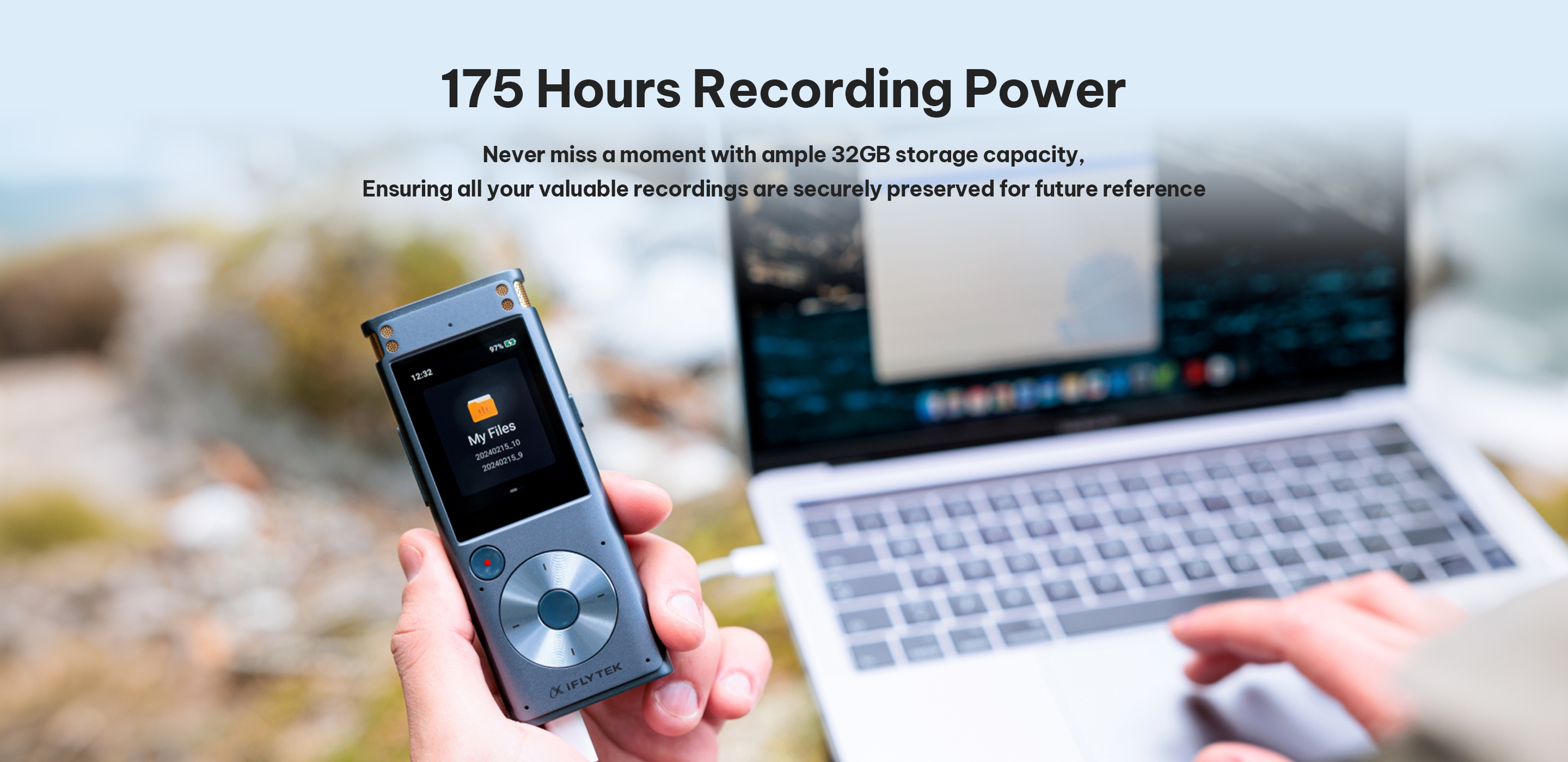 iFLYTEK small recording devices have 32GB of storage space and can support up to 7 hours of continuous recording. The maximum duration of each recording file is 5 hours, and the total recording time is up to 175 hours.